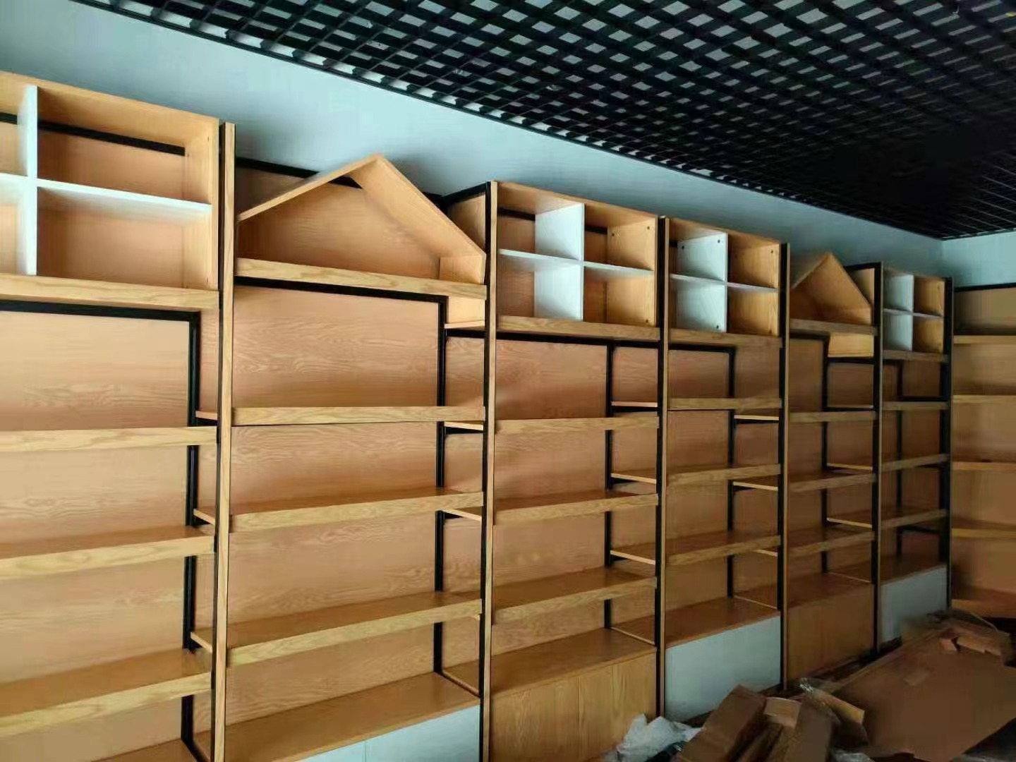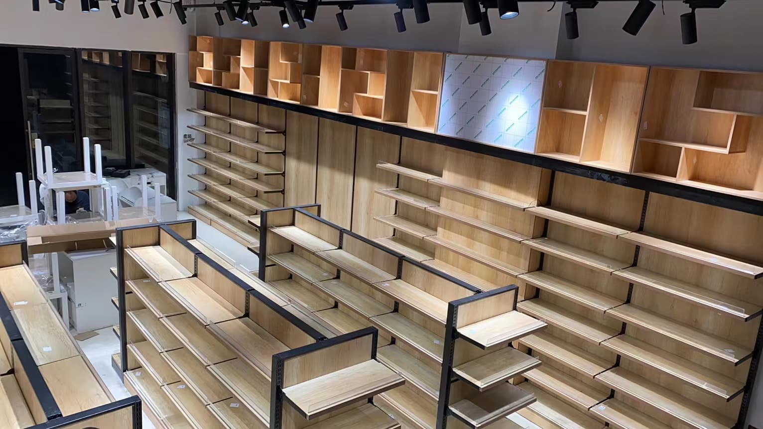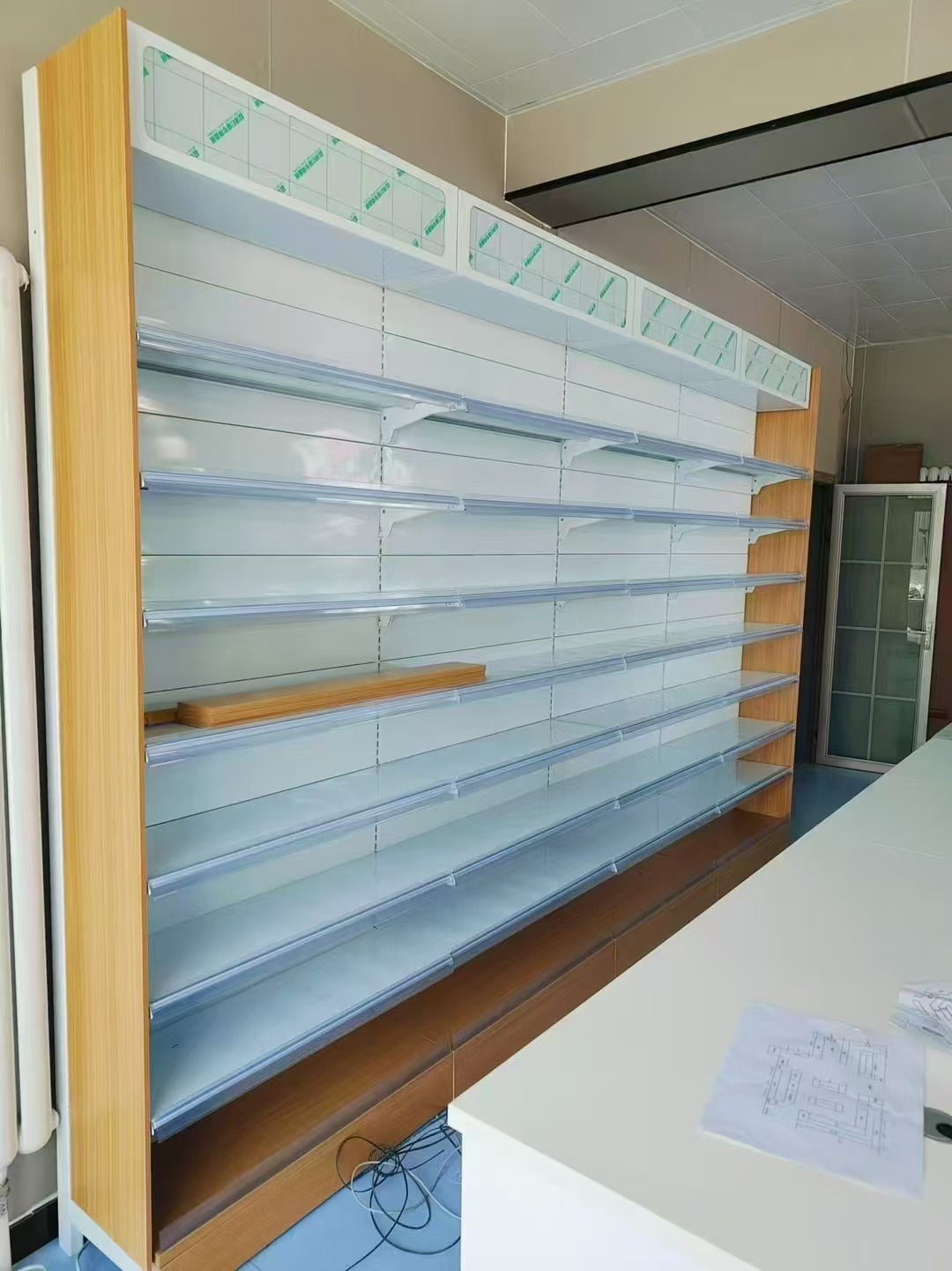 貨架承載:鋼木靠墻貨架帶頂部造型